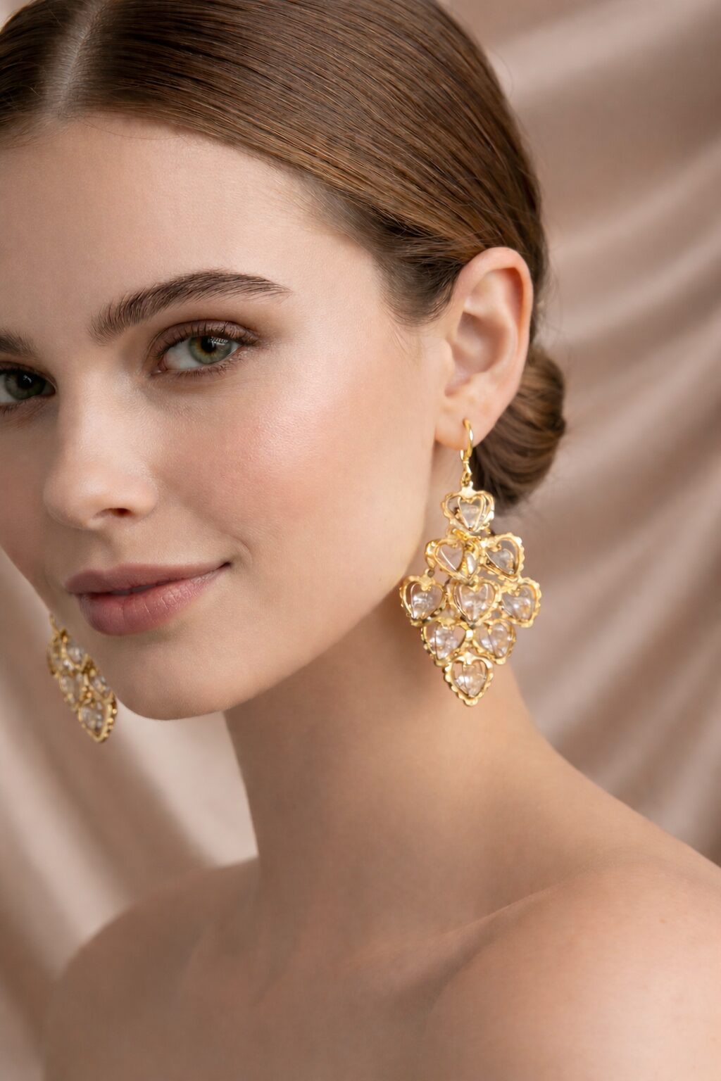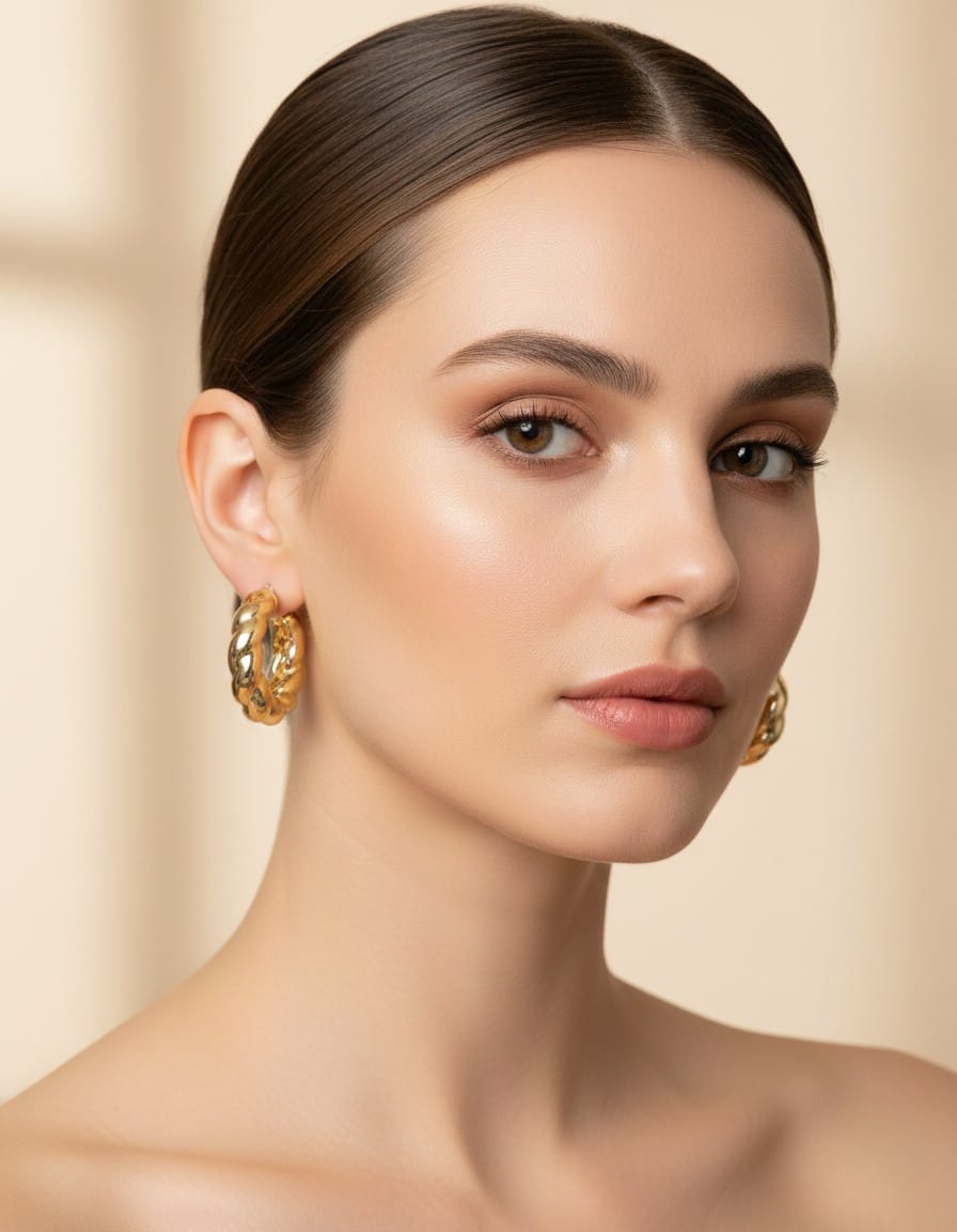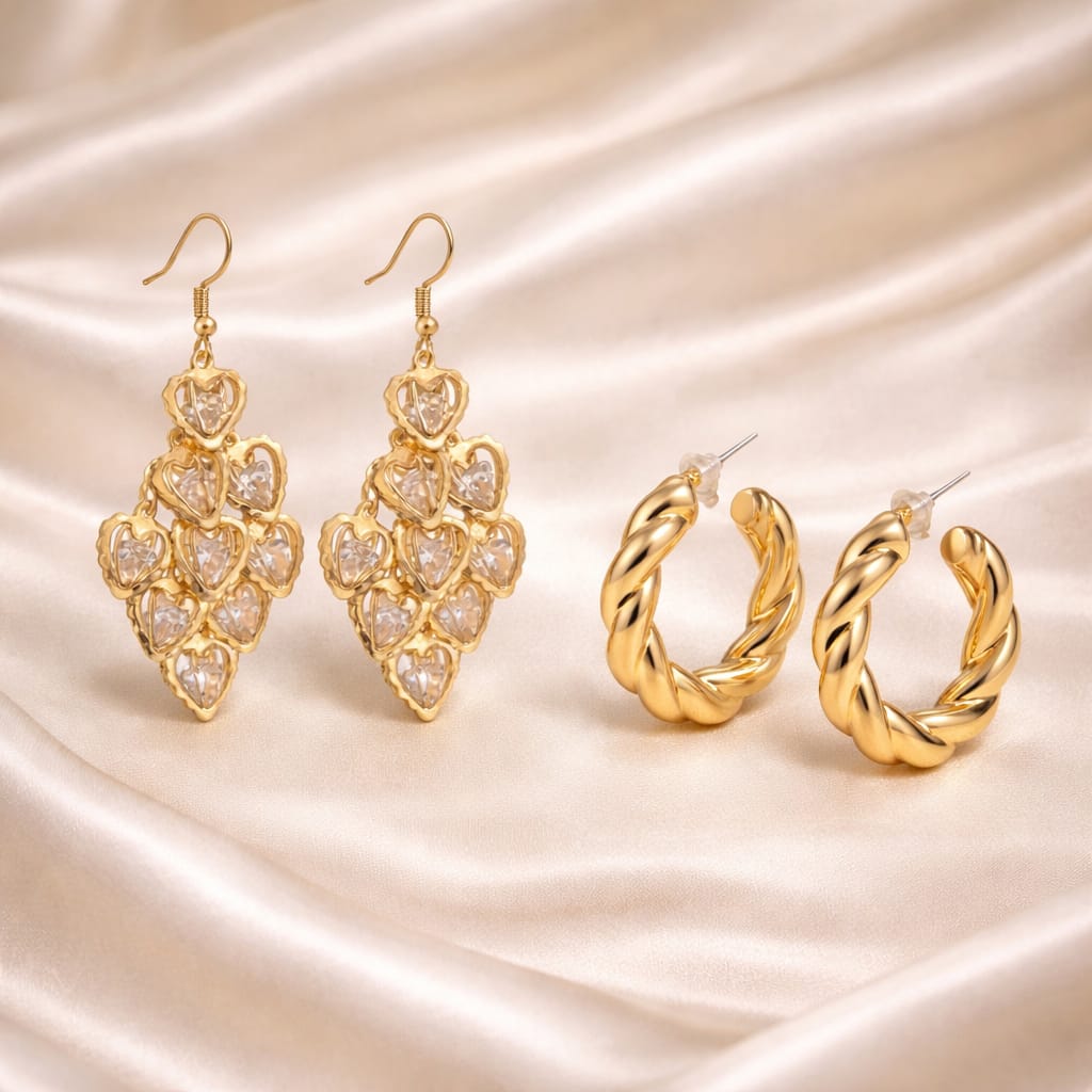 It lets you switch effortlessly between bold statement and minimal styling. The crystal drop earrings feature a beautiful clustered design that adds sparkle and sophistication, making them perfect for weddings, parties, and festive occasions. On the other hand, the twisted gold hoop earrings offer a timeless appeal, ideal for daily wear, office looks, or casual outings.