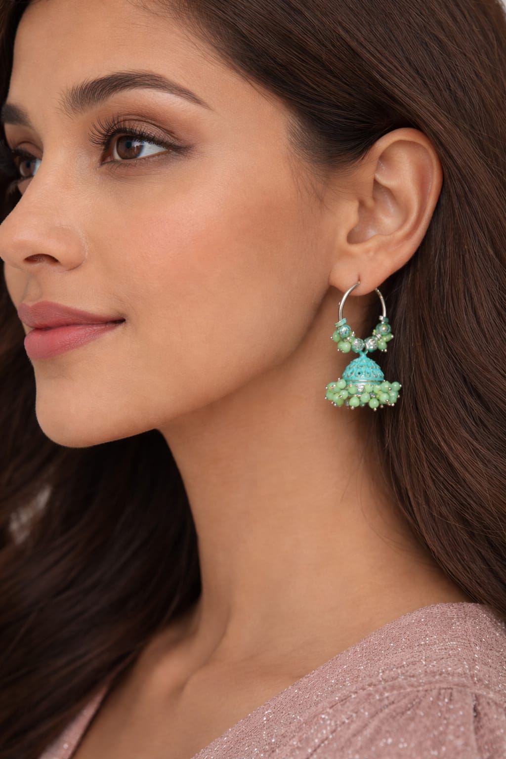 Perfect for gifting, the Light Green Beaded Royal Jhumki Hoops are an ideal choice for birthdays, festive celebrations, and special occasions. Their timeless design and soothing color make them a must-have addition to every jewellery collection.