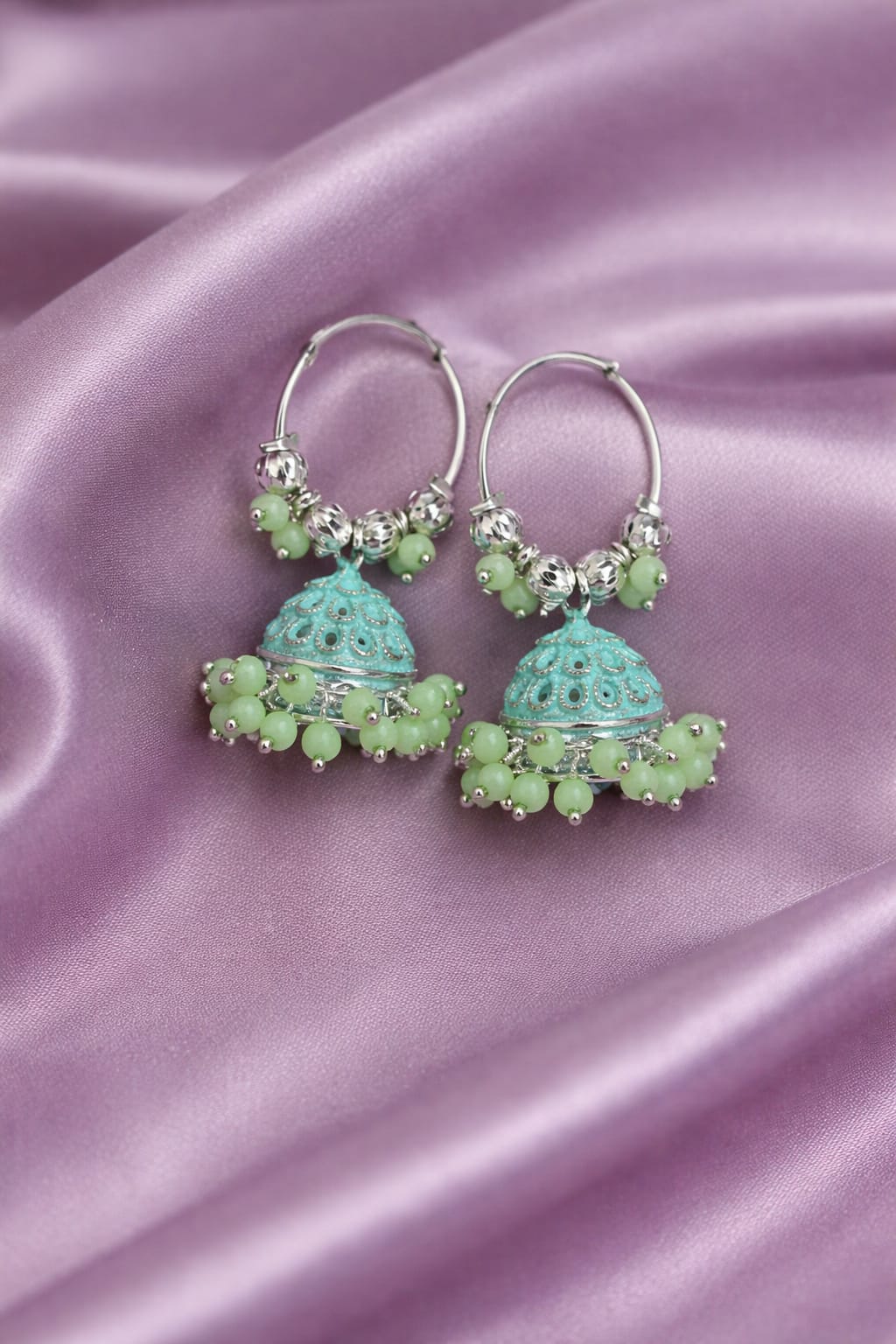 Lightweight and comfortable, the Light Green Jhumki offer ease of wear for long hours without discomfort. The secure hoop design ensures a firm fit while maintaining a stylish and traditional look.