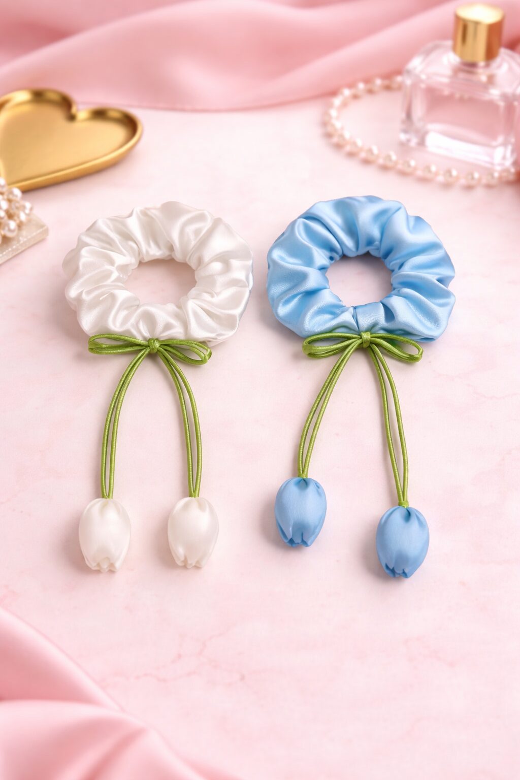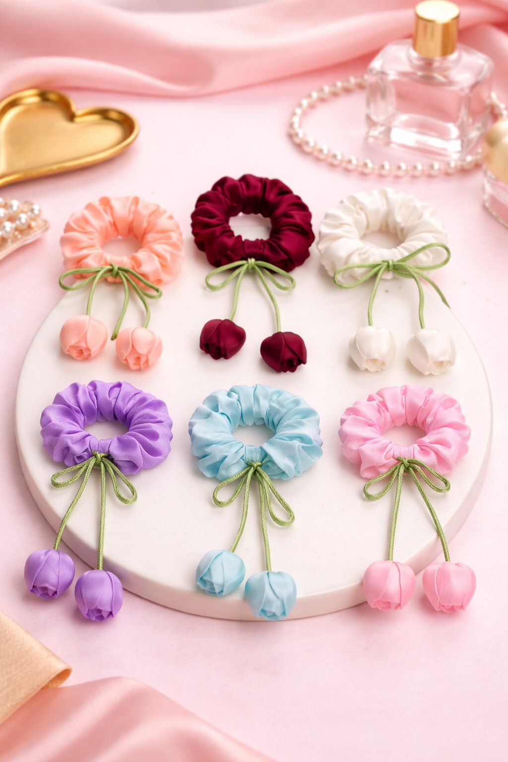 Each scrunchie in this Satin Tulip Scrunchies features beautifully crafted satin petals that create a fuller, more voluminous appearance compared to regular scrunchies. The glossy satin finish adds a luxurious shine, making them perfect for both casual wear and special occasions like parties, weddings, or festive events.